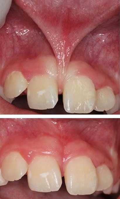 Su aparición en niños es causada debido a el hueco que se produce entre dos dientes, también denominado diastema. Si el infante tuvo problemas en la lactancia provocados por este frenillo, es probable que se presenten también problemas dentales, por lo que se sugiere rutinas efectivas de higiene para prevenir la acumulación de bacterias en la zona.